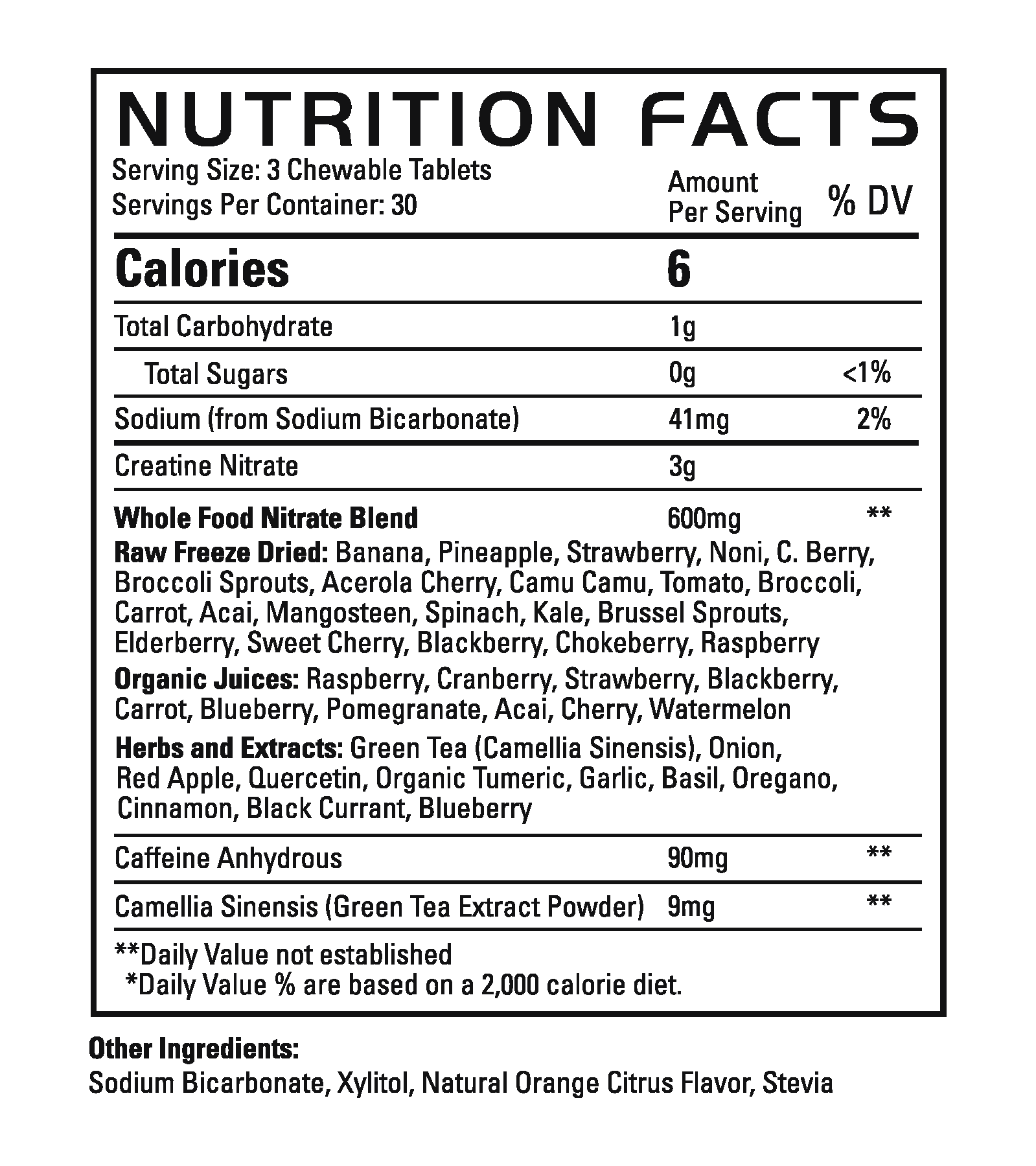 Each chew delivers 30mg of herbal caffeine alongside creatine nitrate — one of the most bioavailable forms of creatine available — to support strength, endurance, and blood flow from your very first chew. No powder. No shaker. No prep.